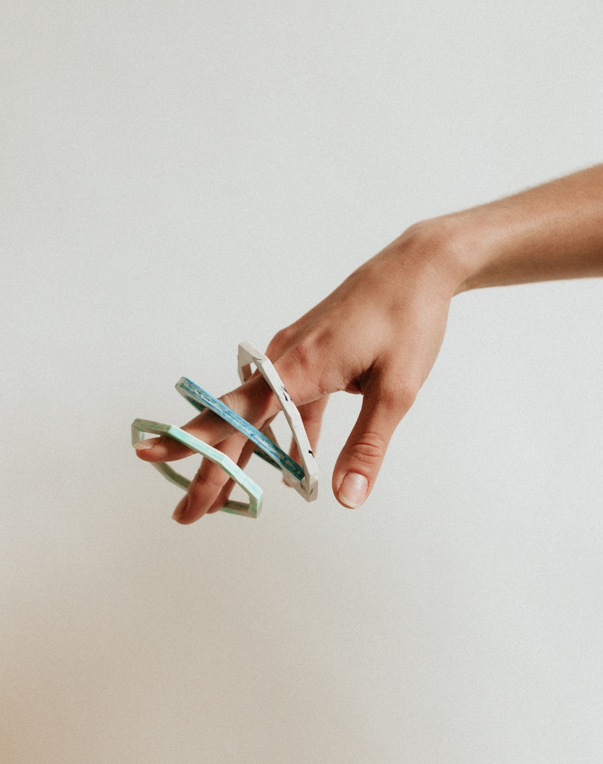 Chaque jonc est unique. Ce bracelet rigide en plastique recyclé arbore une forme octogonale à l’intérieur comme à l’extérieur, dont les lignes s’entremêlent pour créer un jeu de lumière et de volumes qui sublime le poignet avec délicatesse. Il est orné d’une pampille en laiton gravée du logo de la marque Iwa-Lau.